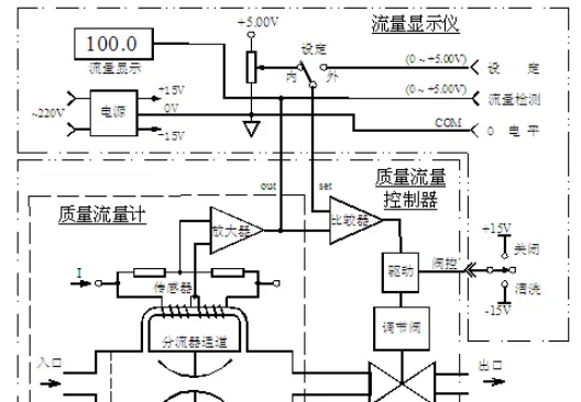 分流器決定主通道的流量。與質量流量控制器配套的流量顯示儀上設置有穩壓電源,數字電壓表, 設定電位器, 外設、內設轉換和三位閥控開關等。氣體質量流量控制器與流量顯示儀連接后的工作原理。