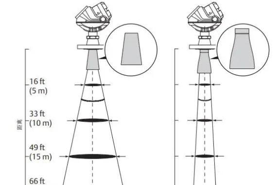 雷達(dá)液位計(jì)的總波束寬度與設(shè)備的頻率成反比。因此對(duì)于同一直徑的天線,如果雷達(dá)液位計(jì)的頻率提高,波束寬度將低于較低頻率的設(shè)備,狹窄的波束可將管嘴、罐壁和干擾物的影響降至最低。如下圖所示(左側(cè)是6 GHZ的,右側(cè)為26GHZ的)。