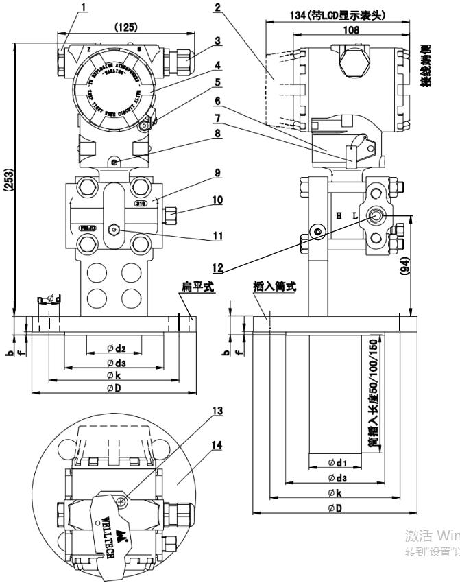 1.電氣密封悶頭 2.電子部件側表蓋 2. 電氣接口:M20×1.5 電纜密封頭 4.接線端表蓋 5.表蓋安全固定扣(防爆) 6.銘牌 7.懸掛式位號牌(選件) 8.電子外殼旋轉定位螺釘 9.低壓側過程法蘭 10.低壓側過程連接悶頭或泄放閥(選件) 11.低壓側側面泄放螺釘(選件) 12.低壓側過程連接:NPT1/4 內螺紋, 法蘭接口符合DIN19213 13.就地按鈕 14.液位法蘭 |